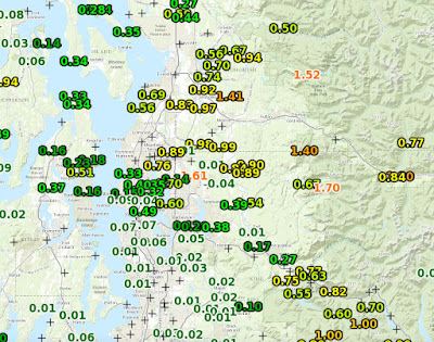 Convergence zones typically drop modest to heavy precipitation from north Seattle to Everett, and this one was no different. To illustrate, here is the 24-h precipitation ending 5 AM Friday morning. A few hundredths of an inch over south Seattle, a half inch north of the ship canal, and roughly an inch over Snohomish county. Even more around Monroe and the Cascade foothills.